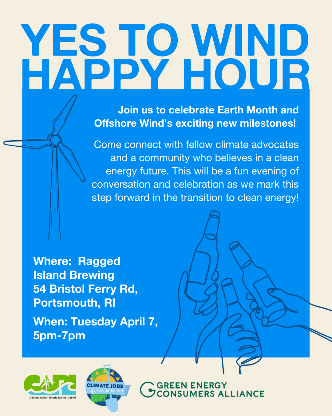 Yes to Wind Happy Hour Tuesday, April 7, 2026 5:00 PM 7:00 PM Ragged Island Brewing 54 Bristol Ferry Road Portsmouth, RI, 02871 United States (map) Google Calendar ICS